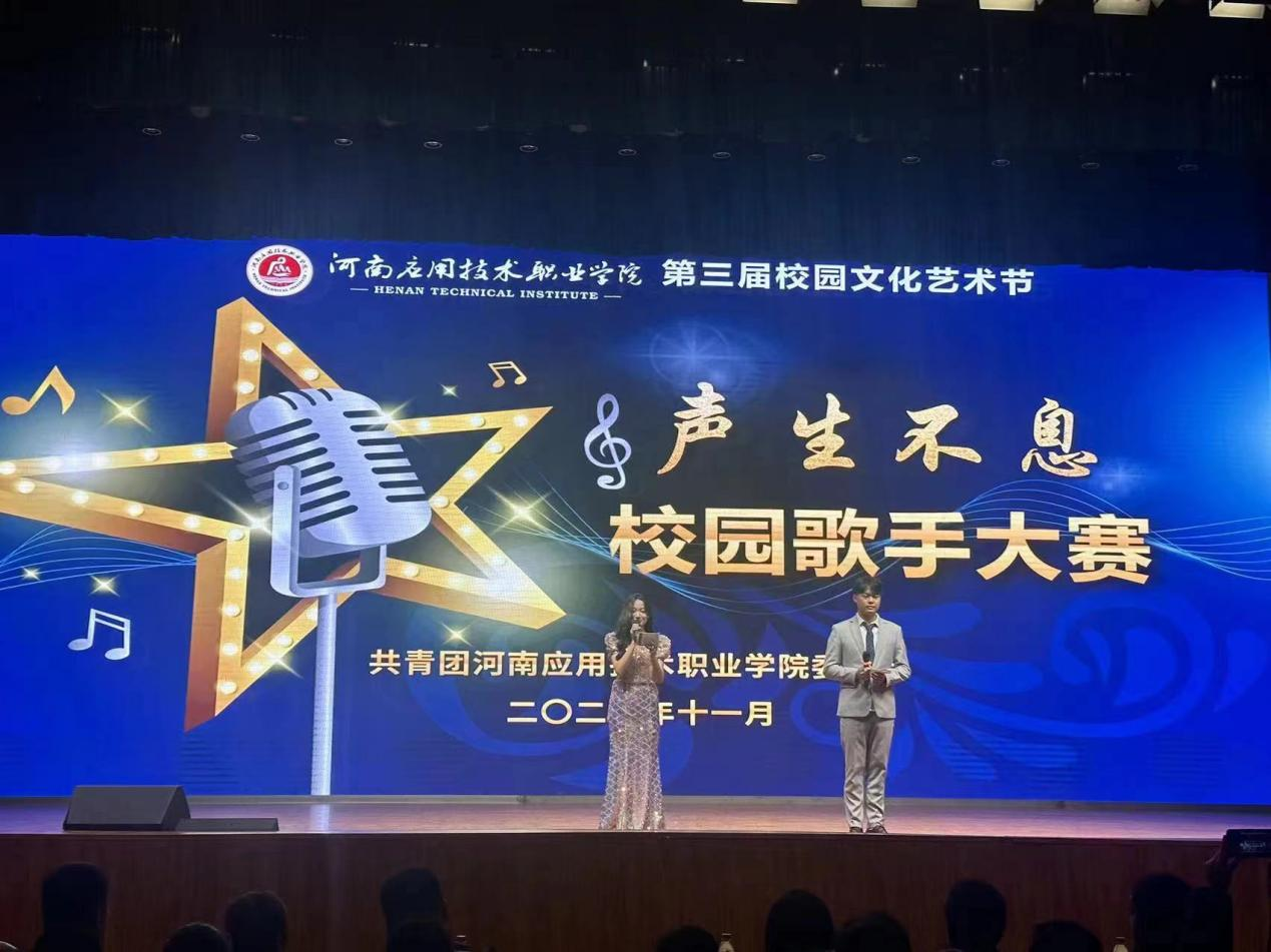 为丰富同学们的校园文化生活,营造一个积极向上、百花齐放的校园文化氛围,给同学们提供一个展现自我的舞台。2023年11月14日,河南应用技术职业学院第三届校园文化艺术节隆重开幕,leyu乐鱼官方网站选手在声生不息校园歌手大赛中光彩四溢。