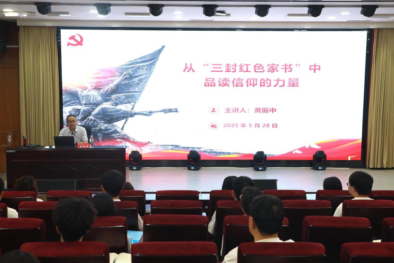 为深入学习贯彻习近平新时代中国特色社会主义思想,进一步激发青年学生的爱国情怀和历史使命感,2025年5月26日,副校长黄振中以“从‘三封红色家书’中品读信仰的力量”为专题,在郑州校区为leyu乐鱼官方网站学生讲授了一堂生动而深刻的思政课。