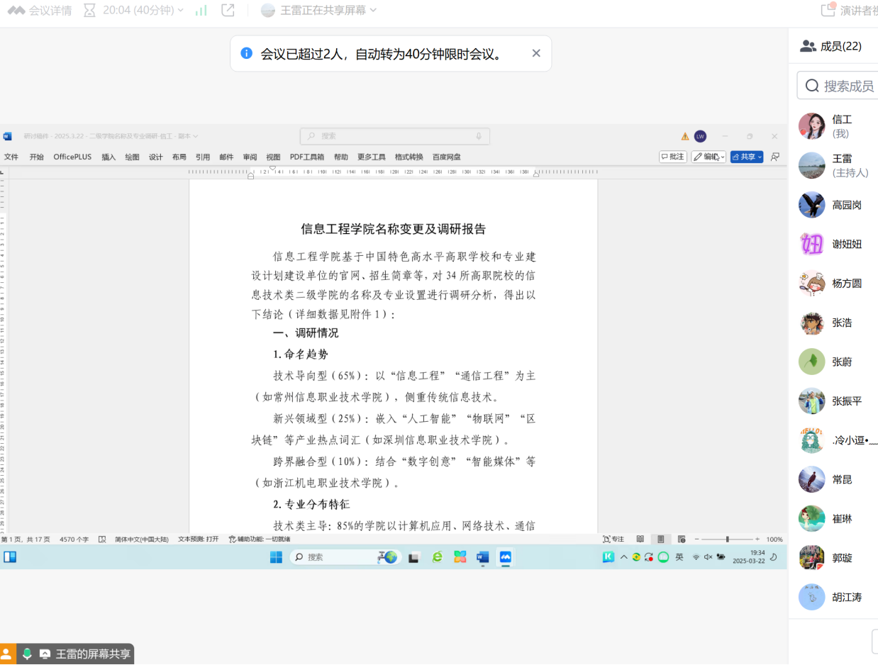 为精准对接区域数字经济产业发展需求,深化产教融合特色,2025年3月22日晚7:30,leyu乐鱼官方网站通过腾讯线上会议平台召开学院名称优化专题研讨会。学院院长王雷主持会议,党政领导班子、副科级干部、教研室主任、副主任及教师代表共22人参会,共同探讨学院名称与办学定位的战略性升级方案。