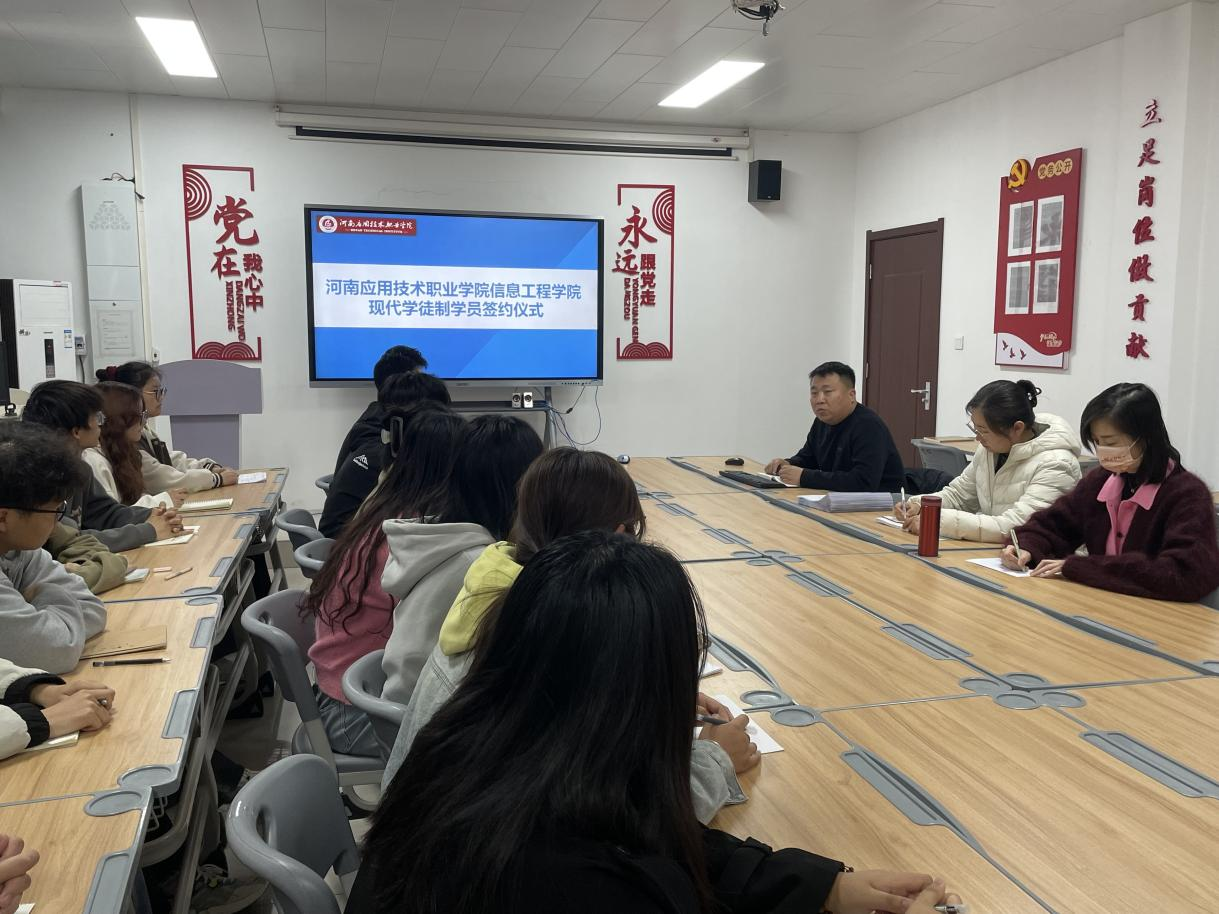 在签约仪式上,学院院长王雷和企业代表专家发表了热情洋溢的致辞。王院长强调了现代学徒制在职业教育中的重要性,就如何更好地开展现代学徒制下的人才培养工作进行了阐释和解读,分享了经验和看法。企业专家代表李功坤经理明确了就业指导工作应更加注重学生的个性化需求,加强与企业的沟通合作,以提升学生的就业竞争力和职业发展能力,随后详细介绍了协议内容、实习安排和注意事项,并鼓励学生们要珍惜机会,努力学习实践技能,为将来的职业发展打下坚实的基础。学生们纷纷表示将积极参与实习,努力提升自己的实践能力。辅导员李晨老师现场组织各位学员签订了现代学徒制学员协议。