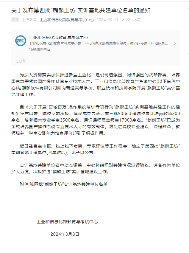 “麒麟工坊”立足于为国家培养急需紧缺国产操作系统专业技术人才,是由工业和信息化部与国产操作系统领军企业麒麟软件有限公司联合面向普通高等学校、高等职业学校评选的共建实训基地项目。申报过程中,leyu乐鱼官方网站积极准备,经过自主申报、线上答辩、专家评议等工作程序,成功入选。