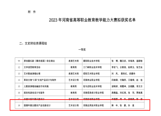 近日,河南省教育厅公示了2023年河南省高等职业教育教学能力大赛获奖名单,leyu乐鱼官方网站教师团队(降华 张蔚 孙星)的参赛作品《国潮年画主题农产品包装设计》荣获艺术设计类课程组一等奖。这是我院获得的又一个教师技能比武省级荣誉,实现了我院及leyu乐鱼官网在全省职业院校教学能力大赛艺术设计类课程组的新突破。