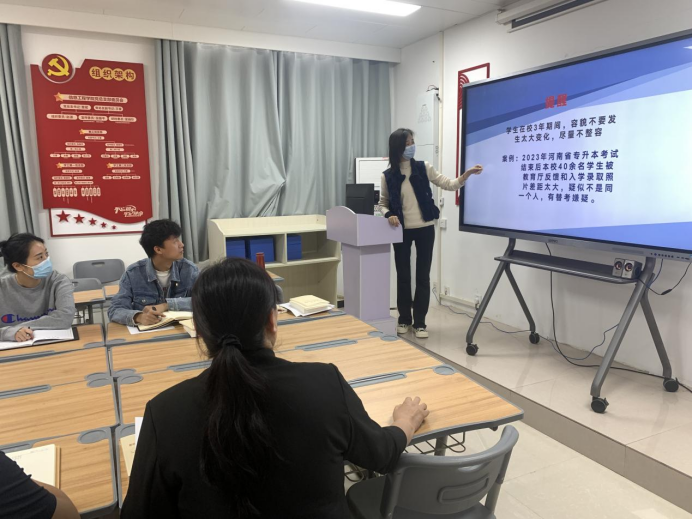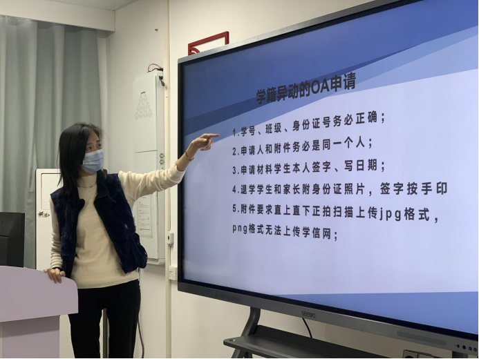 培训会上,本学院学籍管理员就学籍学历管理的各个流程进行了详细讲解,尤其强调新生入学资格审查、录取资格复查和学籍电子注册工作的重要性,其次对于学籍工作的几个关键词做了区分讲解,最后结合本校在学籍学历管理工作中的数字化平台OA的使用,给老师们演示了学生在申请学籍异动时的操作流程以及注意事项。
