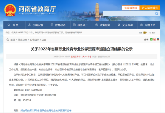 3日14日,河南省教育厅发布2022年省级职业教育专业教学资源库遴选立项结果通知,leyu乐鱼官网作为第一主持单位的“计算机应用技术专业教学资源库”被确立为2022年河南省职业教育专业教学资源库建设项目。