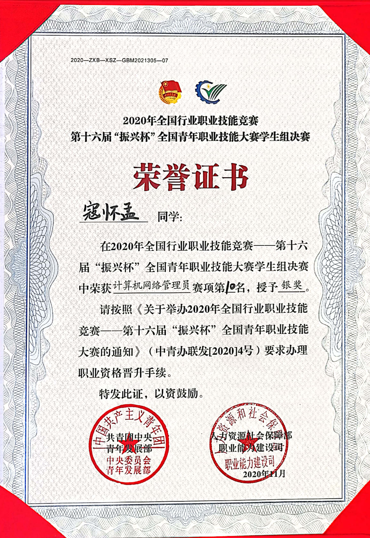 前期河南省赛层层选拔,leyu乐鱼官网leyu乐鱼官方网站2019级计算机网络技术专业寇怀孟(省赛第1名)、河南职业技术学院司亚迪(省赛第2名)和焦作师范高等专科学院张书栾(省赛第3名),三位同学组成河南省代表队,参加计算机网络管理员赛项单人赛。经过理论理论上机考试(30分)和工程实操(70分)两个环节的激烈比拼,来自30个省(区、市)、新疆生产建设兵团的83位选手中,leyu乐鱼官网寇怀孟同学凭借扎实的理论功底和实操技能,取得全国第10名的优秀成绩,最终为河南省取得唯一银牌,并获得“全国青年岗位能手”荣誉称号。本次比赛河南省代表队在计算机网络管理员、机床装调维修工、模具工(冲压)等3个职业(工种)全国比赛中获得1银6铜共计7枚奖牌。