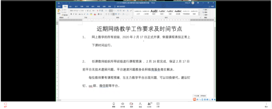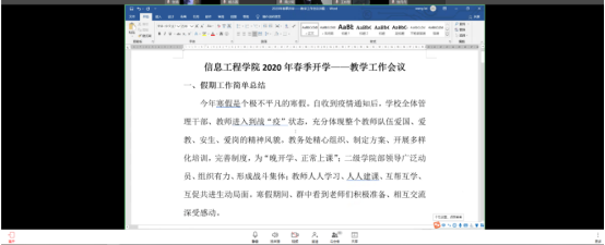 首先王雷院长代表学院传达学校及管理部门教学工作要求,并部署学院相关工作安排;其次崔琳副院长对教学常规、课程教学环节、实训实操课程讲解要求、教学检查注意事项等问题做部署,再次付媛冰主任部署教学办公室工作安排及教师教学运行管理注意事项,最后由杨明杰书记代表学院对教职工特殊时期工作要求及数据统计工作部署,楚斌书记作总结发言。会后,各个教研室主任再次召开本教研室相关人员的网络会议,确切落实此次会议精神。