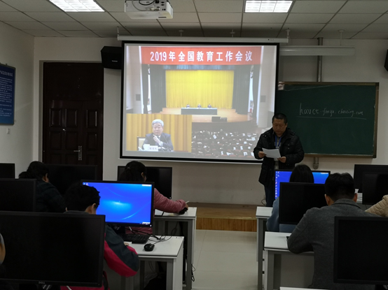 2019年2月26日下午2点,根据校党委统一安排,我院党总支组织全体教职员工认真学习了《陈宝生在2019年全国教育工作会议上的讲话》,会议分别在西校区实训楼E414和东校区519机房进行。