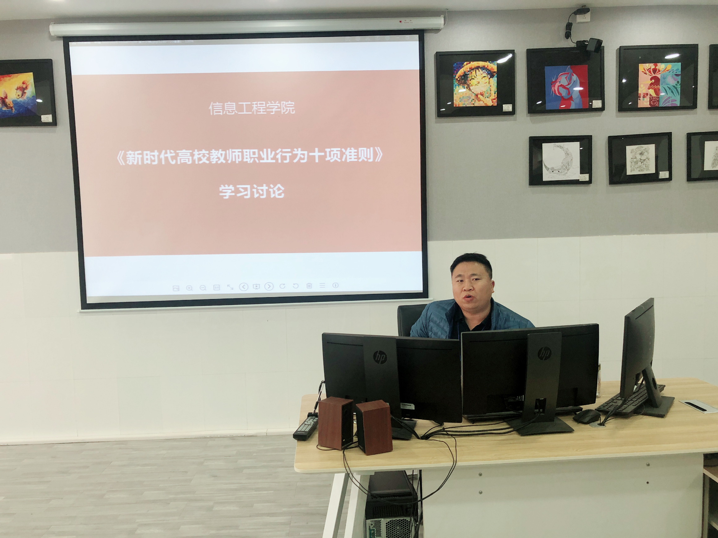 2018年11月20日,leyu乐鱼官方网站在E414实训室召开了关于学习《新时代高校教师职业行为十项准则》的讨论会议。会议上,院长王雷传达了文件精神,并提出要进一步加强师德师风建设,要结合实际,认真学习领会文件精神,贯彻执行文件内容。会中,王雷院长认真分析了文件中的具体内容,为了方便老师们的理解,加深大家的记忆,他将关键词关键句逐字逐句标识出来,我院教师们认真积极学习文件精神,并且进行了激烈的讨论,通过此次会议的学习,我院教师结合自身的教学工作,达到了良好的学习和讨论效果。
