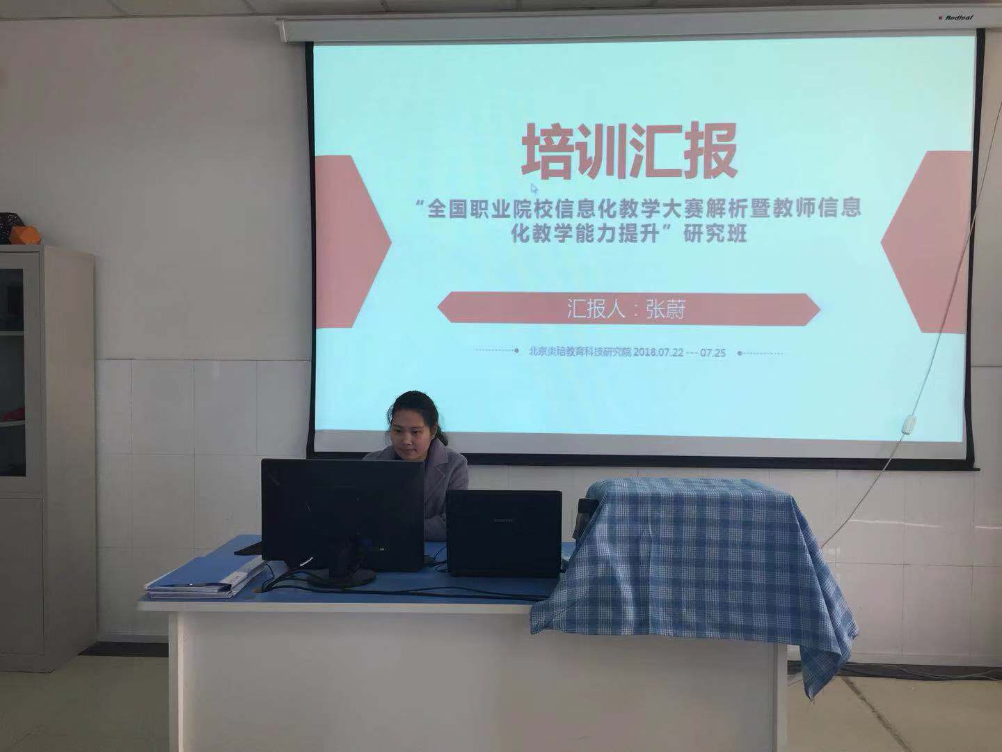 leyu乐鱼官方网站艺术设计教研室教师张蔚于2018年7月22日—7月25日,参加了参加由北京炎培教育科技研究院举办的“全国职业院校信息化教学大赛解析暨教师信息化教学能力提升”高级研修班。通过此次培训在教育教学方面收获颇多,张蔚老师于10月中旬向leyu乐鱼官方网站领导、教师对此次培训进行汇报总结。