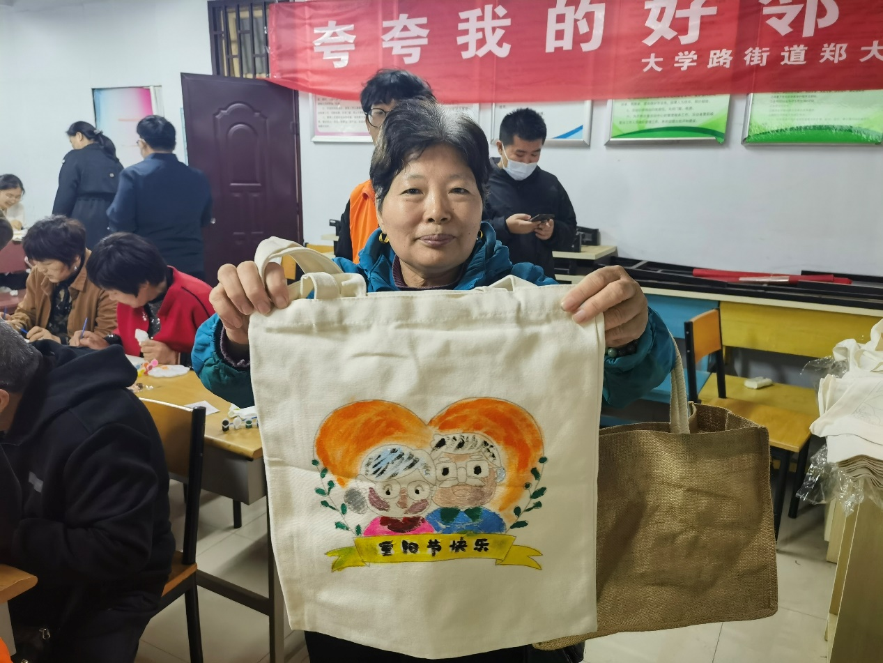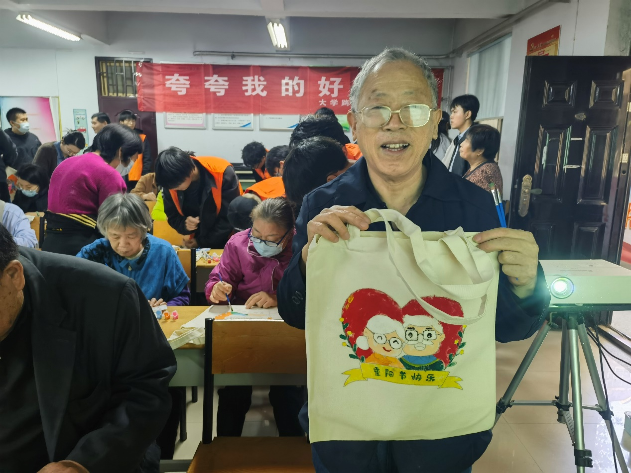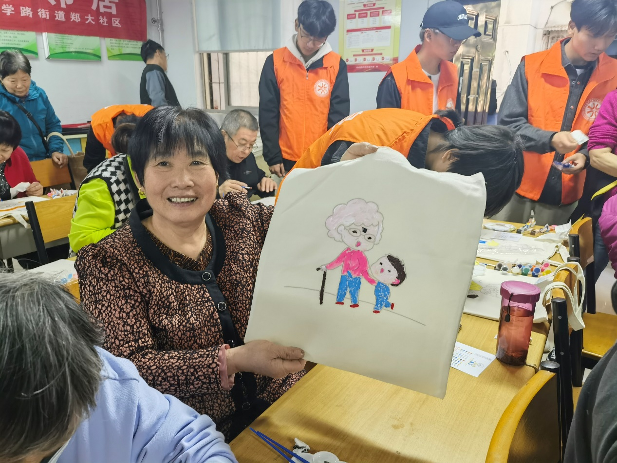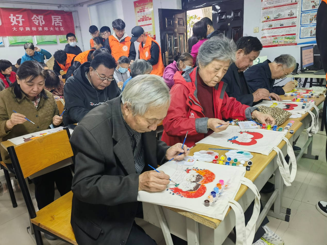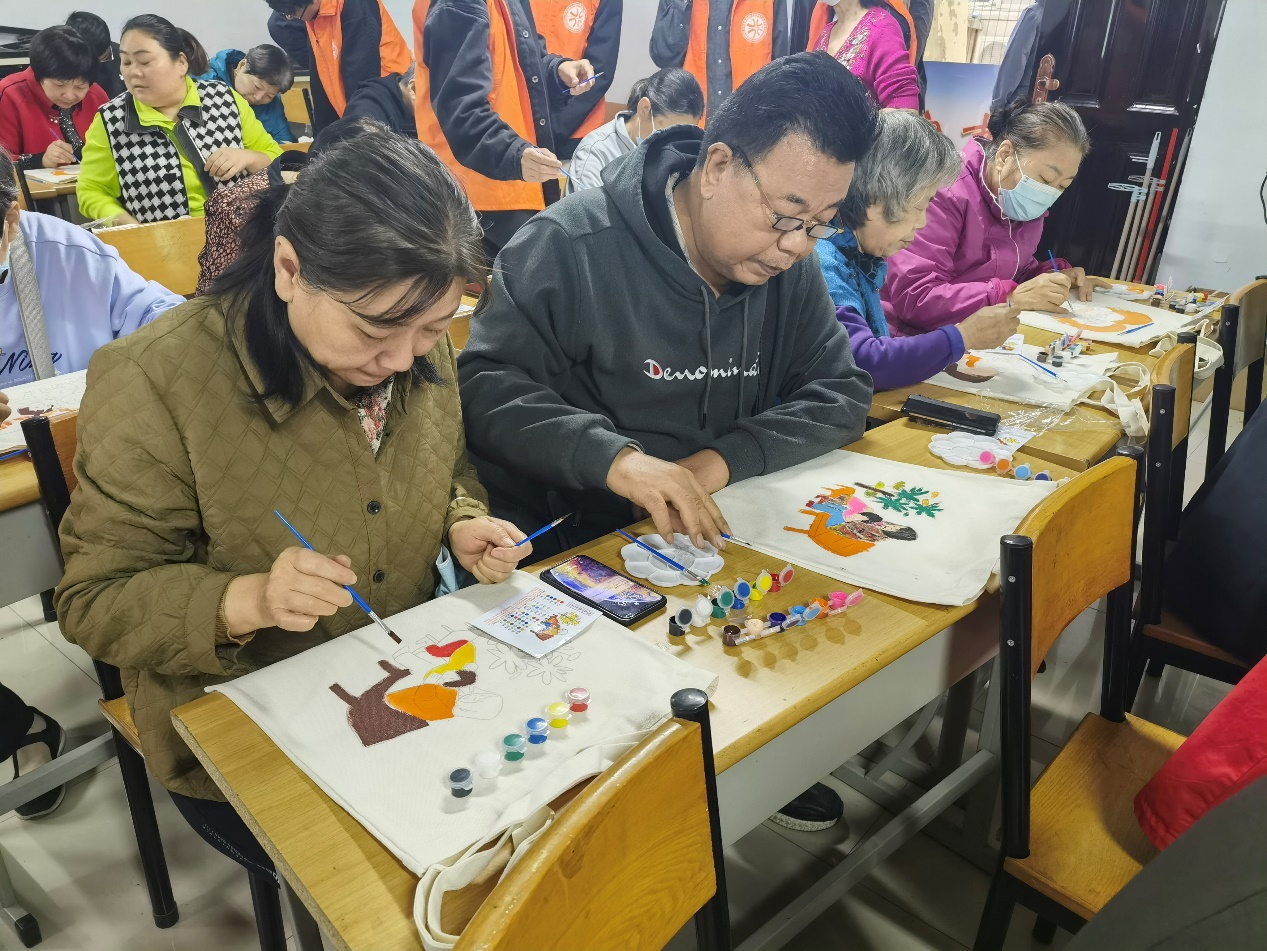 活动中,老人们选好自己喜欢的图案开始绘制布袋,根据布袋上的中图案进行填色创作。老人们聚精会神,相互交流绘画技巧,充分展现了新时代老年人热爱生活、积极乐观的精神风貌。党员教师和学生入党积极分子帮助老人们选颜色、调颜色、洗笔刷、讲技法,在帆布包上涂鸦创作,不仅传递了社会对老年人的温暖与关怀,还展示着职教师生的综合素养,现场气氛一派祥和。