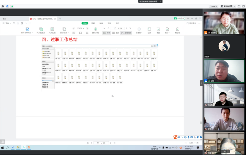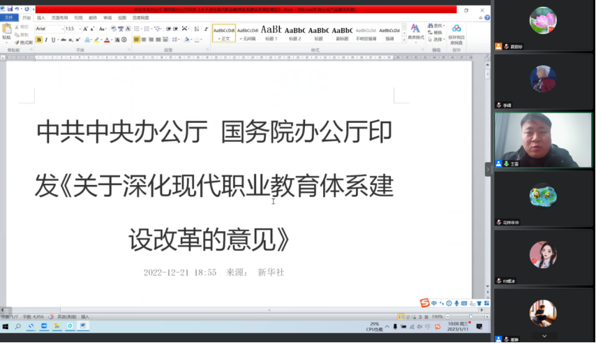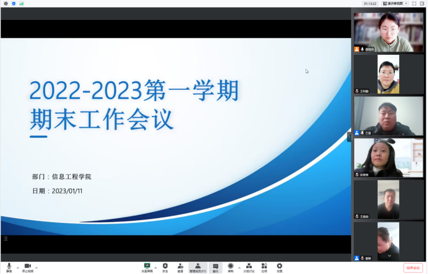 2023年1月11日上午9:30至11:30,leyu乐鱼官方网站通过腾讯会议召开了2022学年工作总结及新学年工作部署大会,会议由夏丽珍副院长主持,王雷院长和崔琳书记做整体工作部署,全体专兼职教师参会。