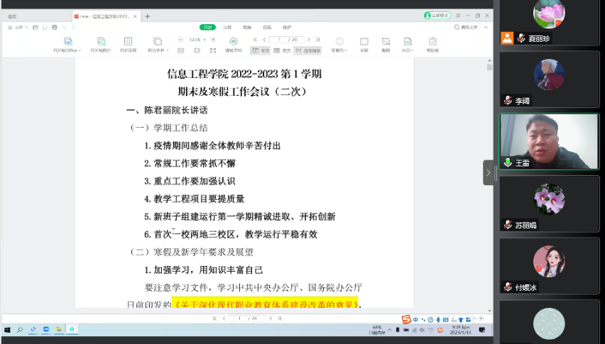 接下来,王雷传达教务处赵扬处长关于本学期重点工作及标志性成果的总结,梳理需要改进的工作,明确寒假和下学期重点工作,提出紧跟国家教育形势,重点在师德师风建设、双高建设、校企合作、产业融合、特色专业国际认证等方面下苦功夫,确保落实落地产出成果。