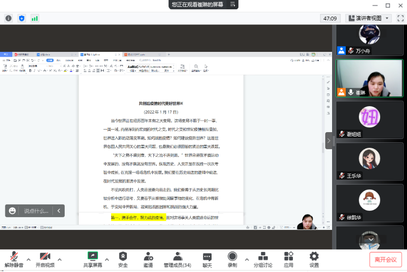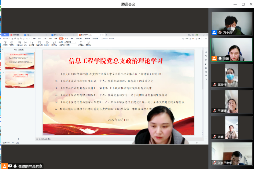 为持续学习贯彻好党的二十大精神,达到了统一思想、坚定信心、明确方向、鼓舞斗志的目的,12月13日下午,leyu乐鱼官方网站党总支组织东西校区全体党员及教职工,在腾讯会议开展线上政治理论学习活动,集中学习了:《求是》2022年第23期--在党的十九届七中全会第二次全体会议上的讲话(12月1日);《习近平谈治国理政》第四卷:十九、完善全球治理,践行真正的多边主义;《全面从严治党向基层延伸》:第七章上下联动推动巡视巡察向基层延伸;《习近平经济思想学习纲要》:十二、统筹发展和安全--关于我国经济发展的重要保障;《习近平生态文明思想学习纲要》:八、共谋全球生态文明建设之路--关于生态文明建设的全球倡议。本次政治理论学习由leyu乐鱼官方网站党总支书记崔琳主持,全体党员及教职工参加会议。