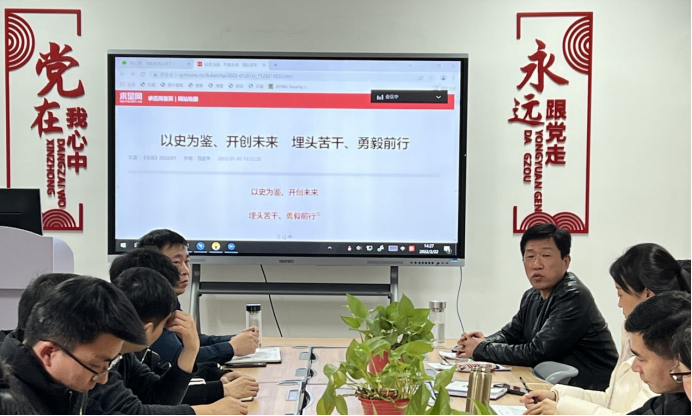 发习近平总书记在党的十九届六中全会第二次全体会议上的重要讲话----《以史为鉴、开创未来、埋头苦干、勇毅前行》会上,楚斌首先带领大学学习了2022年第1期《求是》杂志刊。讲话中,习近平总书记号召全党同志从党的奋斗历程中汲取智慧和力量。深刻认识总结党的百年奋斗重大成就和历史经验的重大意义;深刻认识党的百年奋斗的初心使命;深刻认识中国特色社会主义进入新时代的历史性成就和历史性变革;深刻认识党的百年奋斗历史经验;深刻认识以史为鉴、开创未来的重要要求。总书记强调坚定历史自信,自觉坚守理想信念;坚持党的政治建设,始终保持党的团结统一;坚定担当责任,不断增强进行伟大斗争的意志和本领。