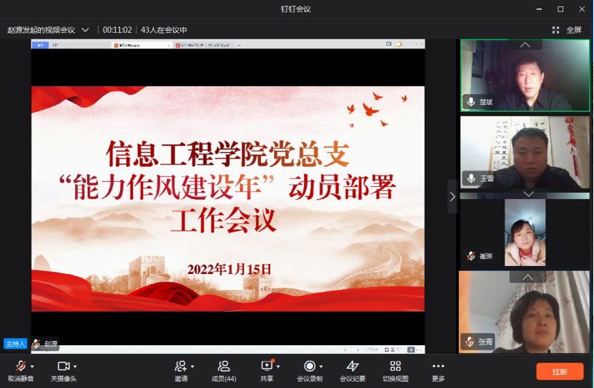 为深入学习贯彻党的十九届六中全会精神,贯彻落实习近平总书记视察河南重要讲话、重要指示,推进leyu乐鱼官网治理体系和治理能力现代化,动员广大党员干部践行初心使命、强化“答卷”意识,切实把校党委“能力作风建设年”活动部署落实落细,2022年1月15日晚八点,leyu乐鱼官方网站党总支组织全体教师通过钉钉会议平台开展主题党日活动,进行网上集中学习,会议由leyu乐鱼官方网站党总支书记楚斌主持。