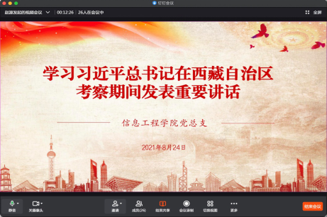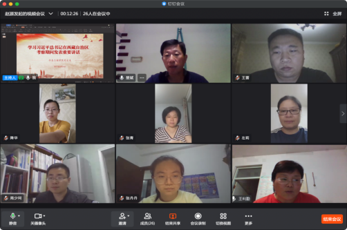 为认真贯彻学习习近平总书记在西藏考察时的重要讲话精神,2021年8月24日晚七点半,leyu乐鱼官方网站党总支组织全体党员通过钉钉会议平台进行网上集中学习。会议由leyu乐鱼官方网站党总支书记楚斌主持。