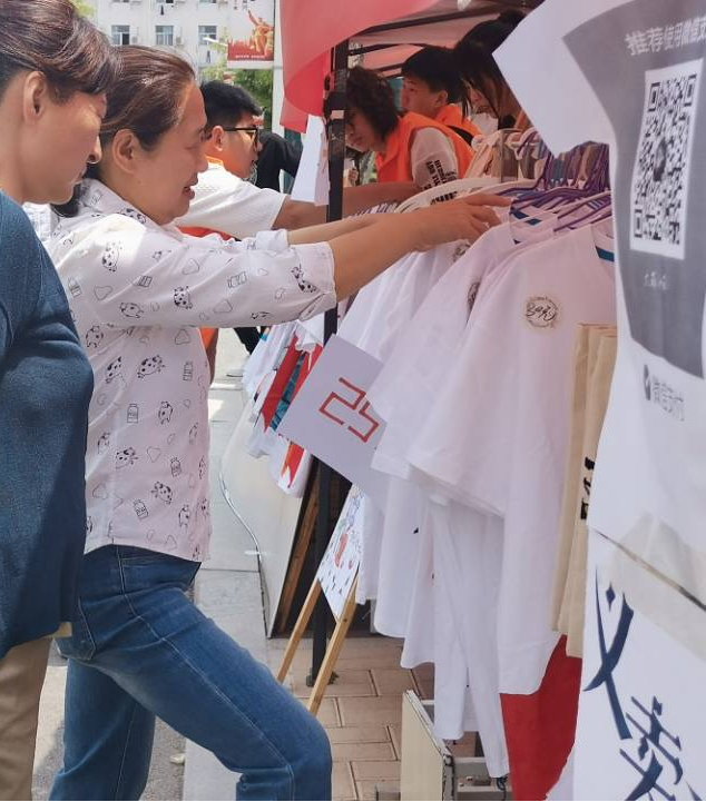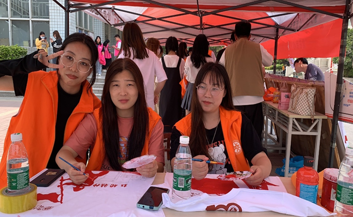 在现场义卖中,现场已画好的图案无法满足广大师生的需求,学院组织相关专业的学生到现场助阵,拿起手中的画笔去满足师生的个性化文化衫及布包的现场定制需求。
