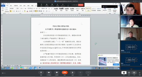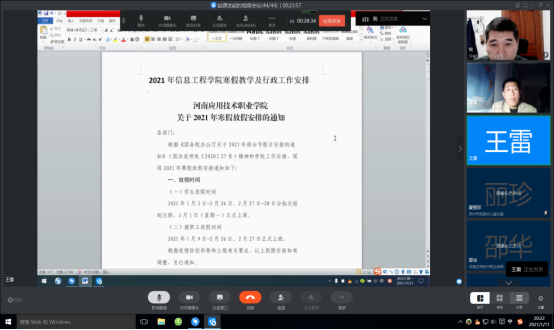 2021年1月11日晚20:00,leyu乐鱼官方网站东西校区全体教师召开钉钉视频会议,安排部署寒假期间的疫情防控、教学工作安排和辅导员学期考核事宜,会议由赵源主持,东西校区参会老师共44人,无缺席。