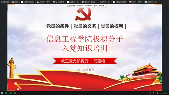 为进一步提高入党积极分子的政治理论水平,加强党员发展工作的质量。2020年5月21日晚,leyu乐鱼官方网站教工支部组织委员马丽艳老师通过QQ群屏幕共享为153名入党积极分子讲述了党课培训第七讲《党员的条件、义务和权利》。