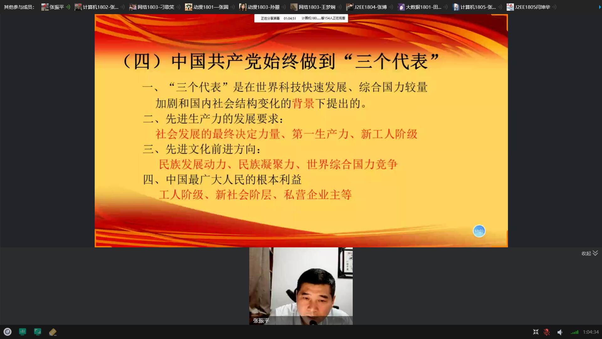 在党的宗旨方面,张老师讲到,共产党员全心全意为人民服务的宗旨是最早由毛泽东同志做出明确而科学的概括,之后在邓小平,江泽民,胡锦涛,习近平同志的领导下丰富发展而来。同时他说道,党的指导思想也在一步步深化和升华,从马列宁主义、毛泽东思想、邓小平理论、“三个代表”重要思想到科学发展观,再到中共十九大习近平新时代中国特色社会主义思想。