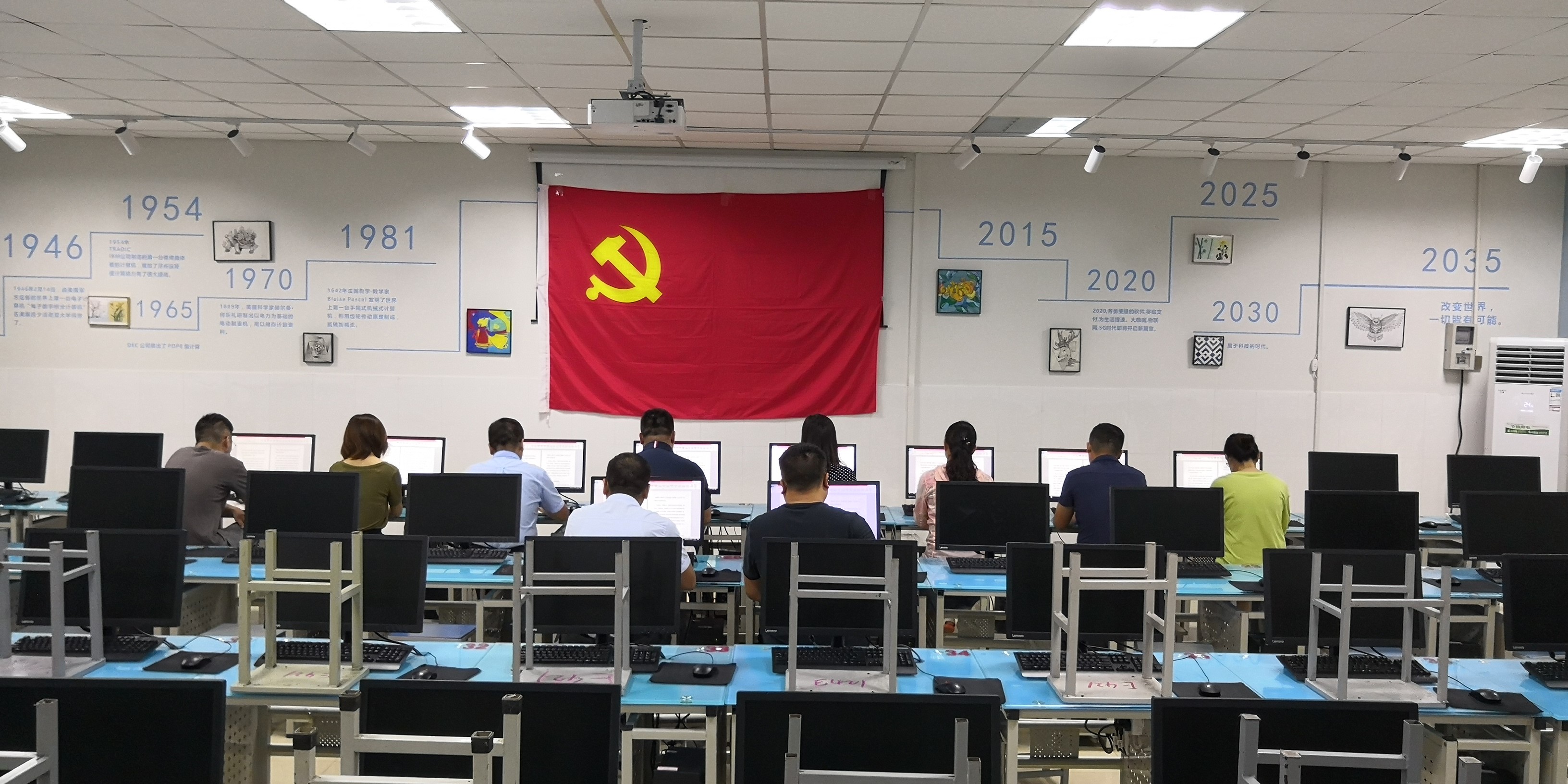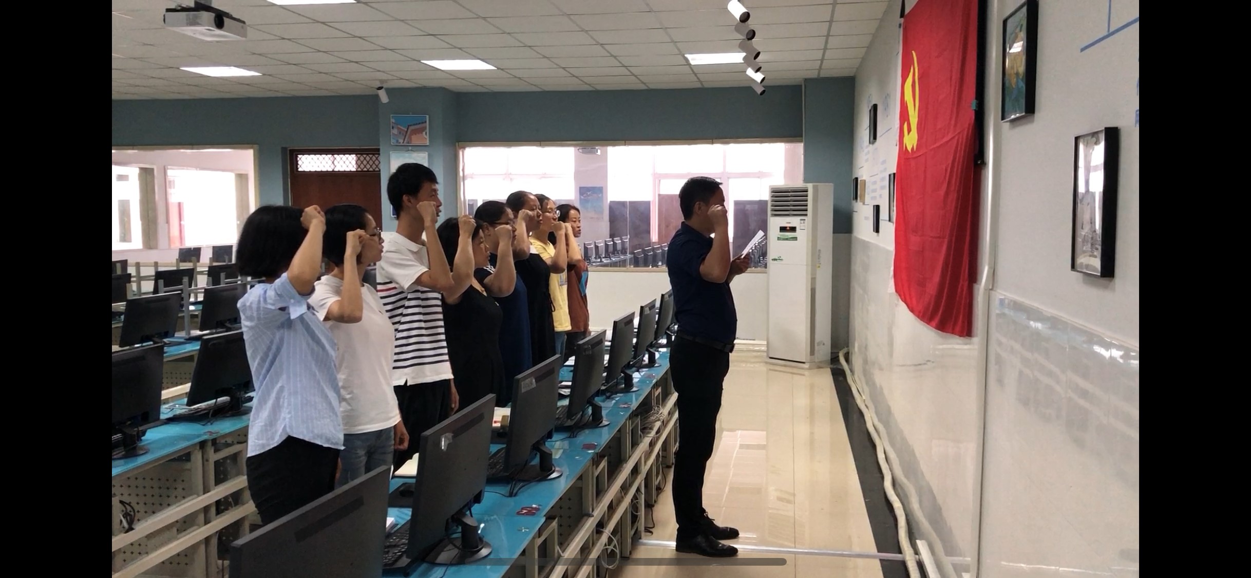 会上,学生第一支部书记杨明杰和教工支部书记王雷带领本支部全体党员学习了习近平总书记带领中央政治局常委瞻仰上海中共一大会址和浙江嘉兴南湖红船时的重要讲话精神,然后面对党旗重温入党誓词。