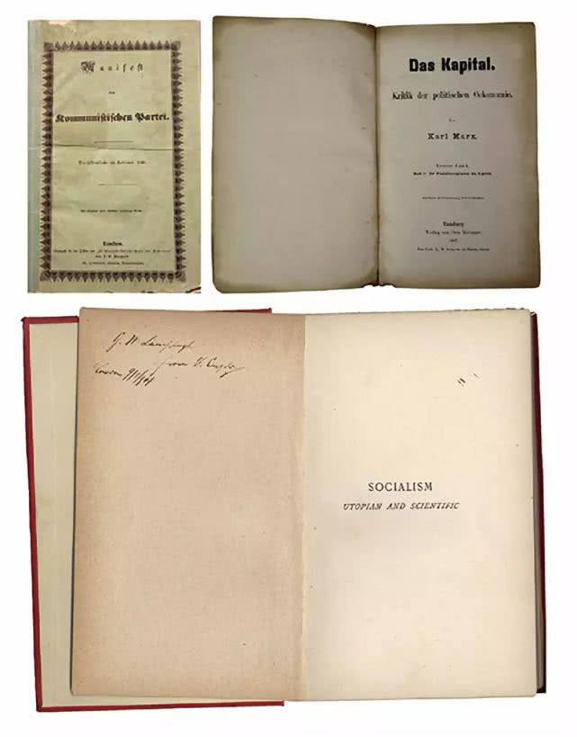 左上图为1848年《共产党宣言》德文第一版。右上图为1867年《资本论》德文第1卷第一版。下图为恩格斯的题字赠书《社会主义从空想到科学的发展》,1892年英文版。 中央党史和文献研究院供图