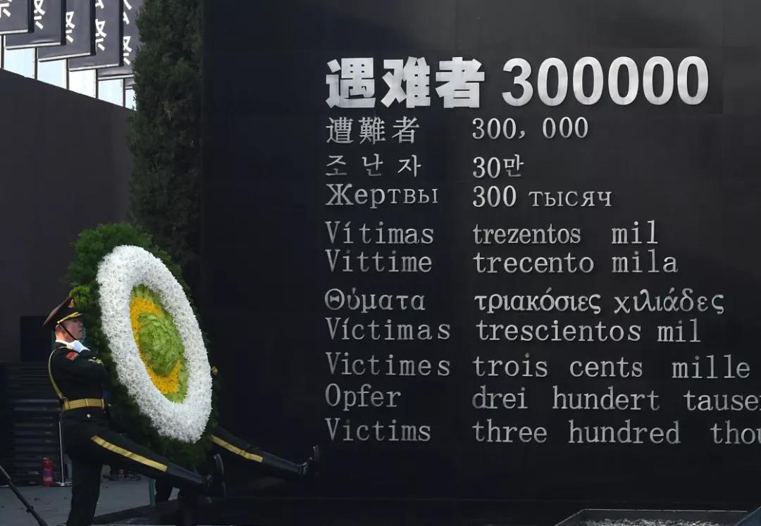 默哀毕,在军乐团演奏的《国家公祭献曲》的旋律中,解放军仪仗大队礼兵将8个花圈敬献于公祭台上。