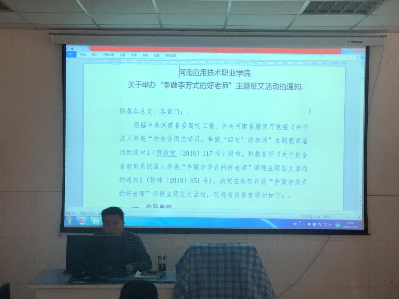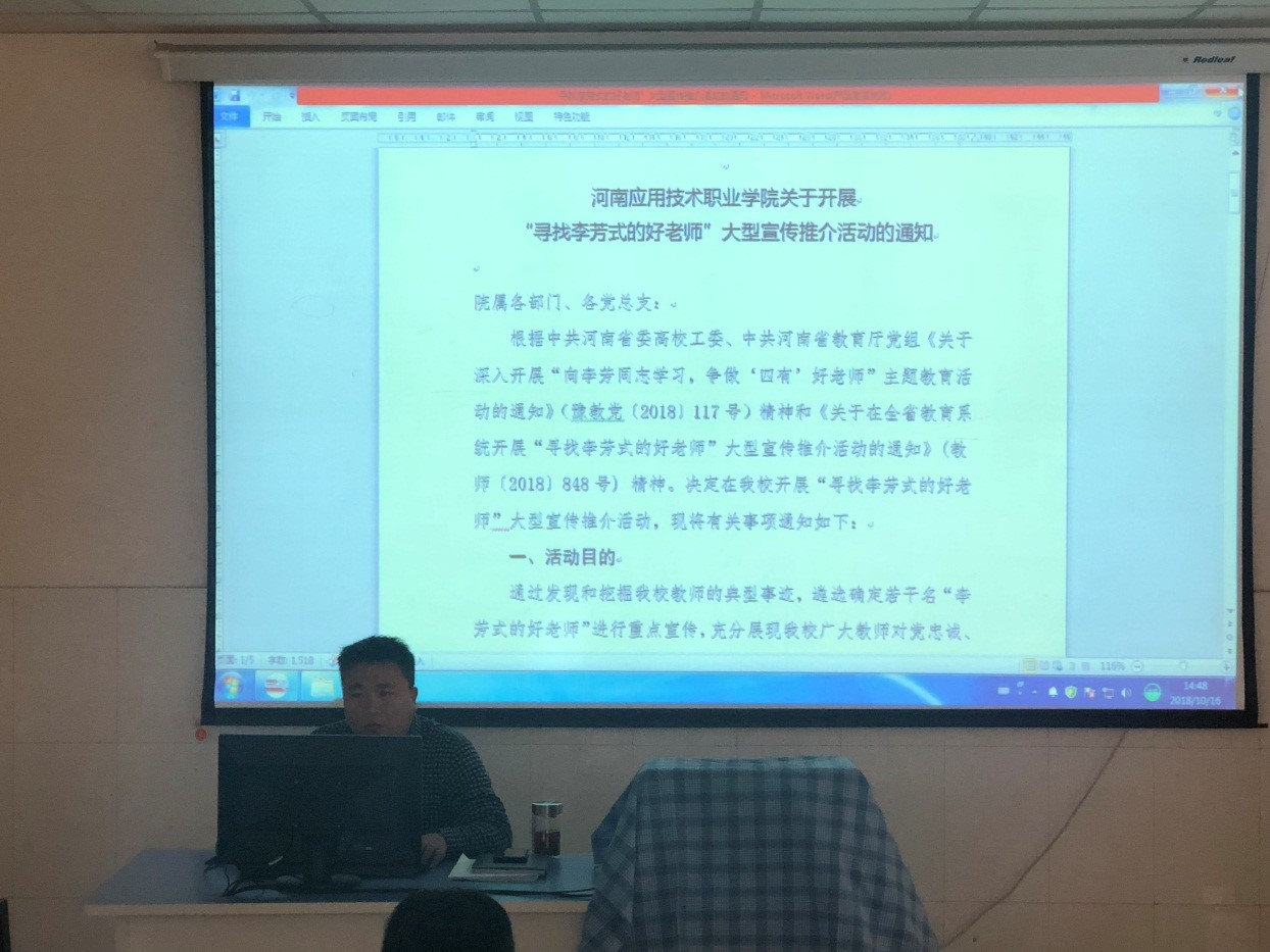 二、传达河南应用技术职业学院关于开展“寻找李芳式的好老师”大型宣传推介活动的通知;关于举办“争做李芳式的好老师”主题征文活动的通知。