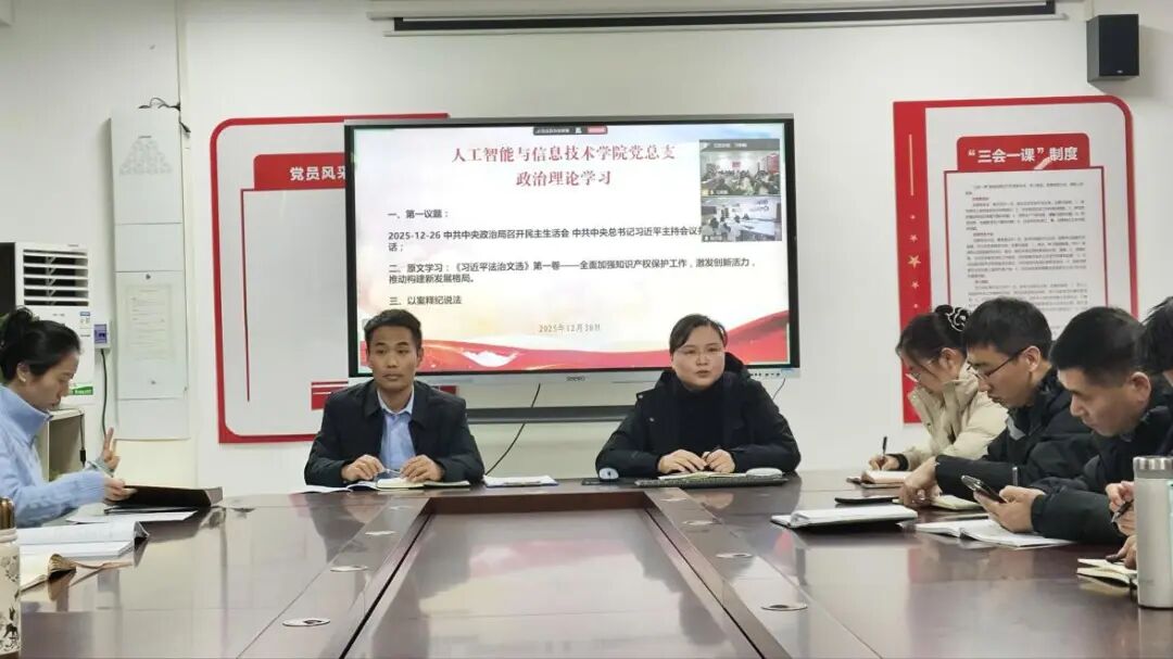 2025年12月30日,leyu乐鱼官方网站党总支组织郑州校区和开封校区全体党员及教职工,开展政治理论学习活动。本次学习活动由leyu乐鱼官方网站书记崔琳主持。主要学习内容有:一、第一议题:2025-12-26 中共中央政治局召开民主生活会中共中央总书记习近平主持会议并发表重要讲话;二、原文学习:《习近平法治文选》第一卷——全面加强知识产权保护工作,激发创新活力,推动构建新发展格局;三、以案释纪说法。