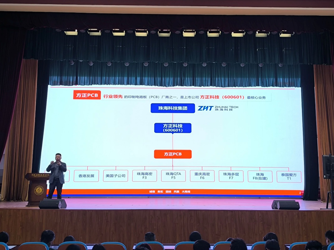 最后,软通动力有限公司、珠海方正PCB等四家合作企业代表依次上台宣讲,详细介绍企业发展历程、业务布局、实习岗位需求、培养体系及职业发展前景,让同学们对行业现状、岗位要求与未来职业发展路径有了更直观、清晰的认知,为后续实习择业提供了有力参考。