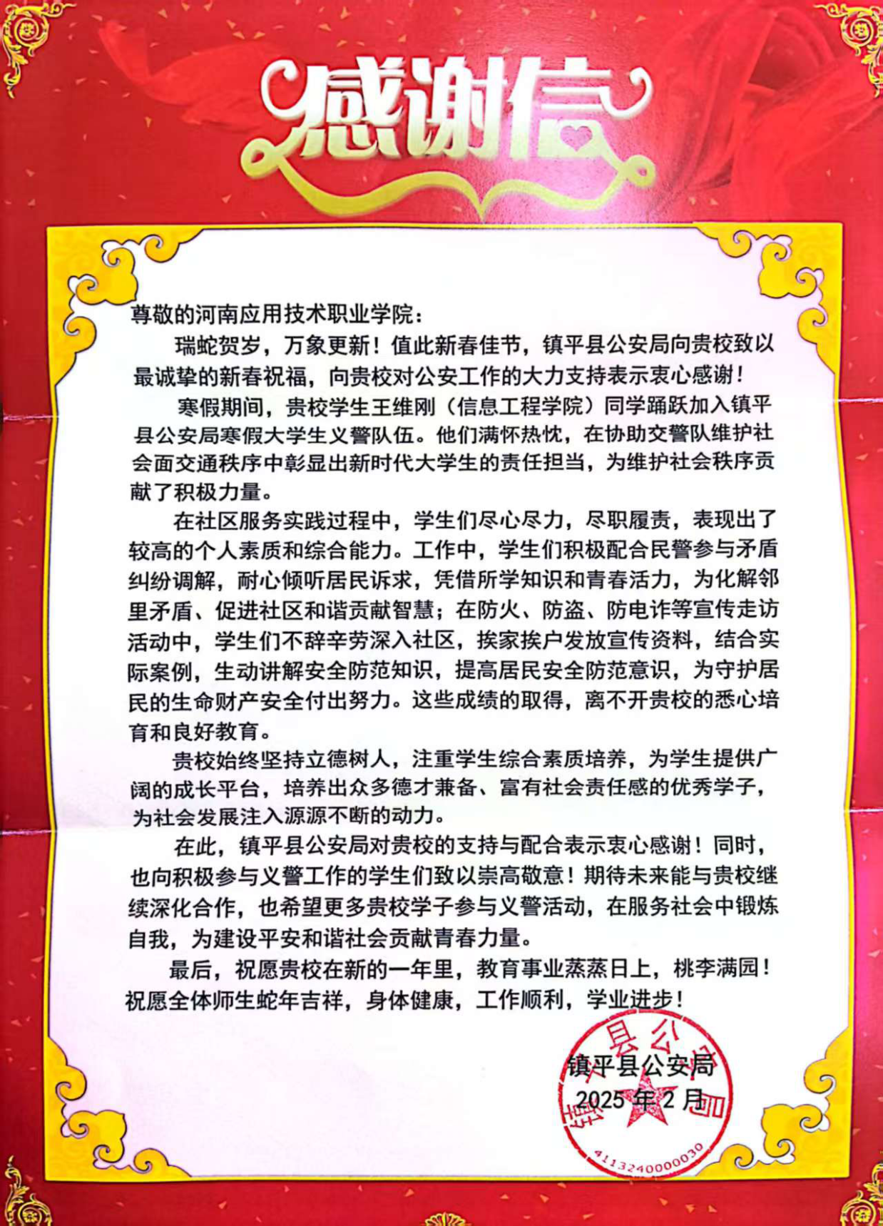 2月21日,leyu乐鱼官方网站收到来自河南省南阳市镇平县公安局的感谢信,信中表达了对我院学生王维刚寒假期间加入镇平县公安局寒假大学生义务警队,协助指挥交通、维护交通秩序的赞扬,也对学校育人成果表示感谢。