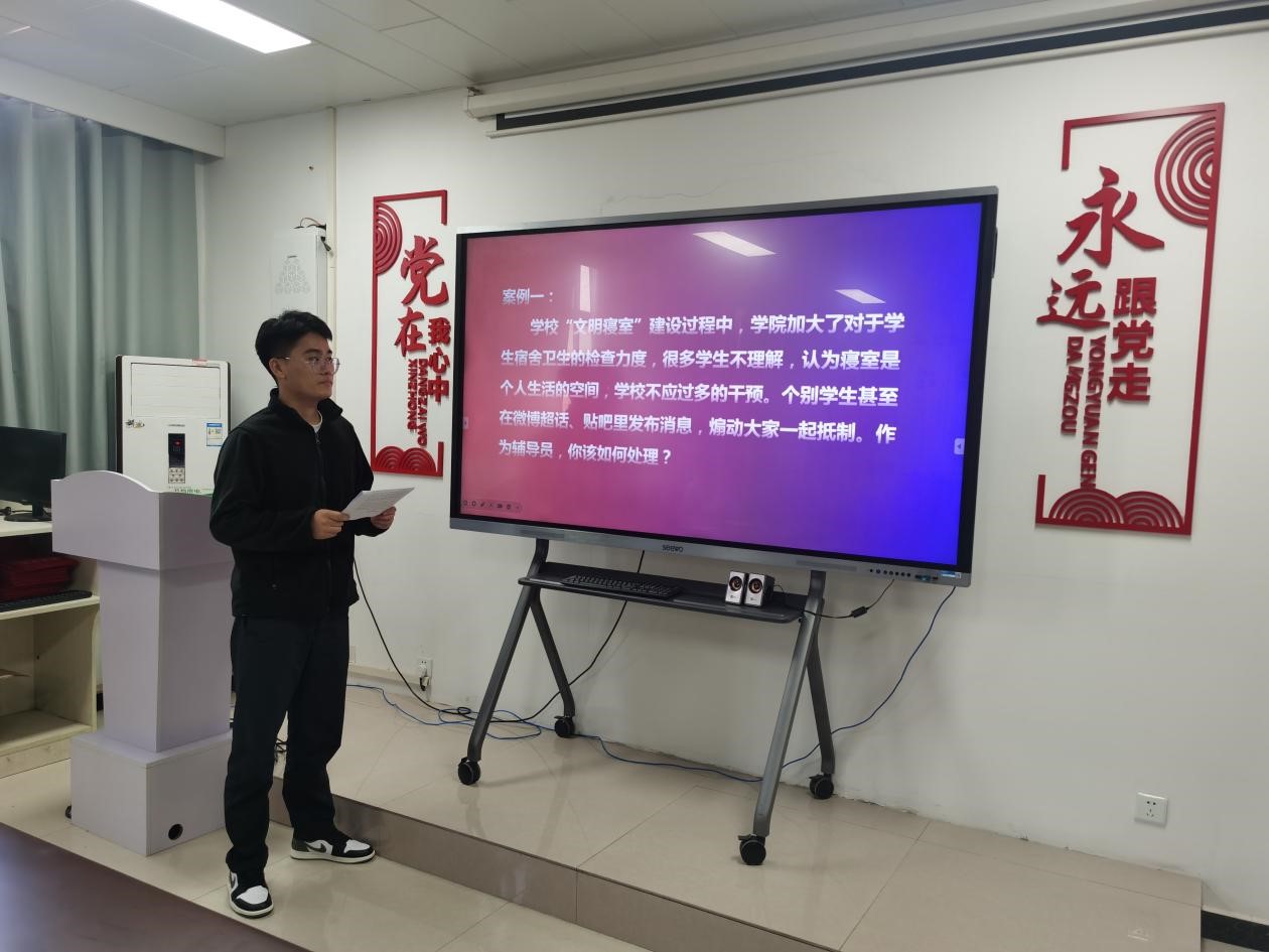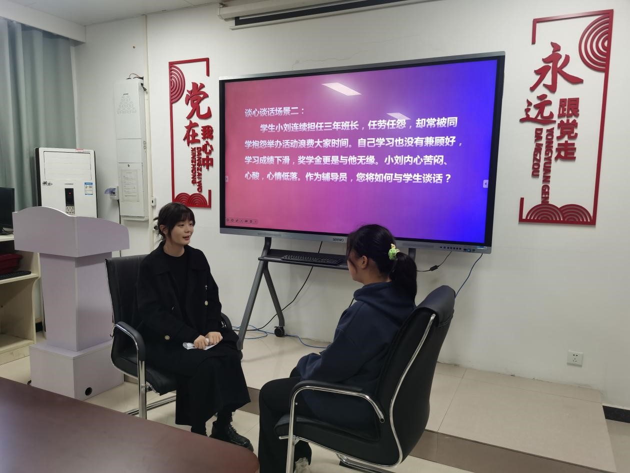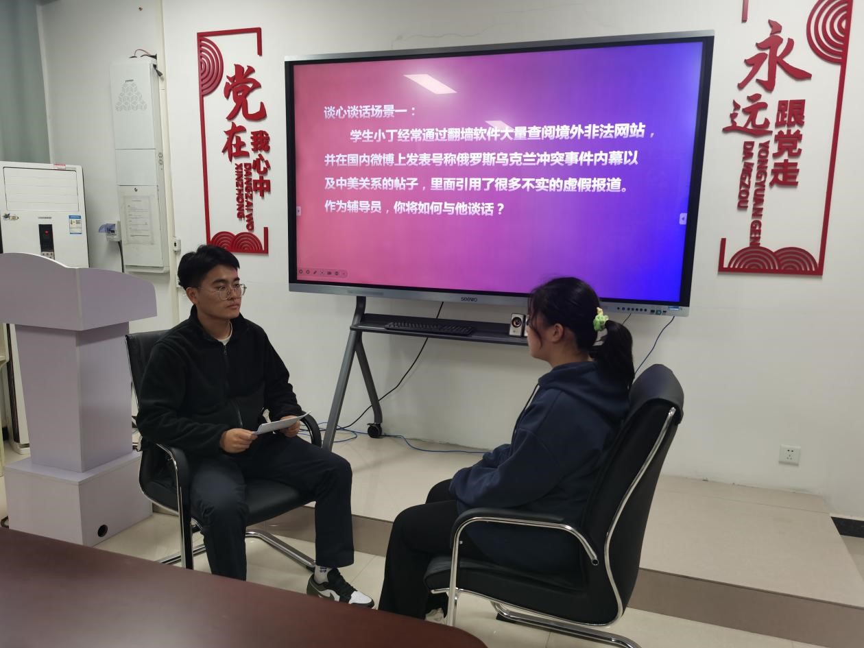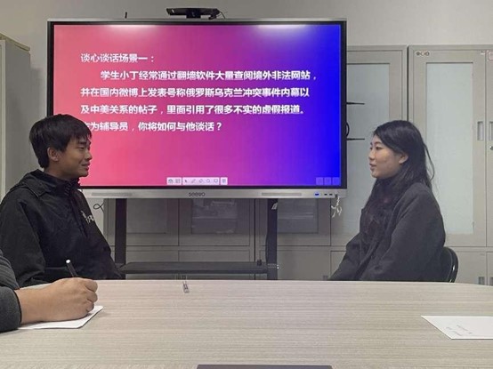 比赛分为理论宣讲、案例分析和谈心谈话的三个部分,重点考查辅导员日常工作中解决学生情感困惑、学业压力、安全教育、奖助评选、人际关系等等问题。参赛选手在比赛中充分展示了辅导员扎实的政策把握能力、全面的信息分析能力与过硬的教育引导能力。