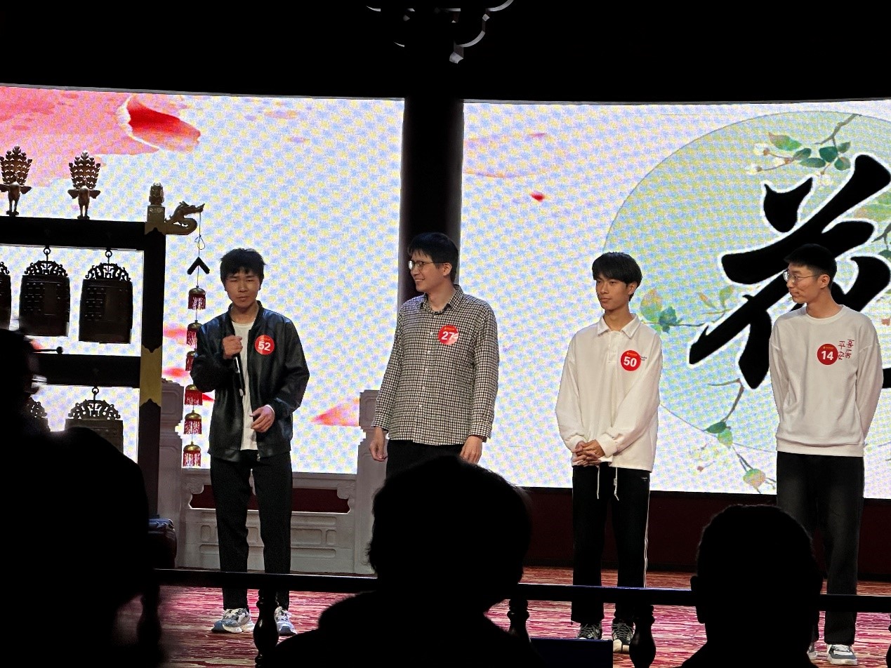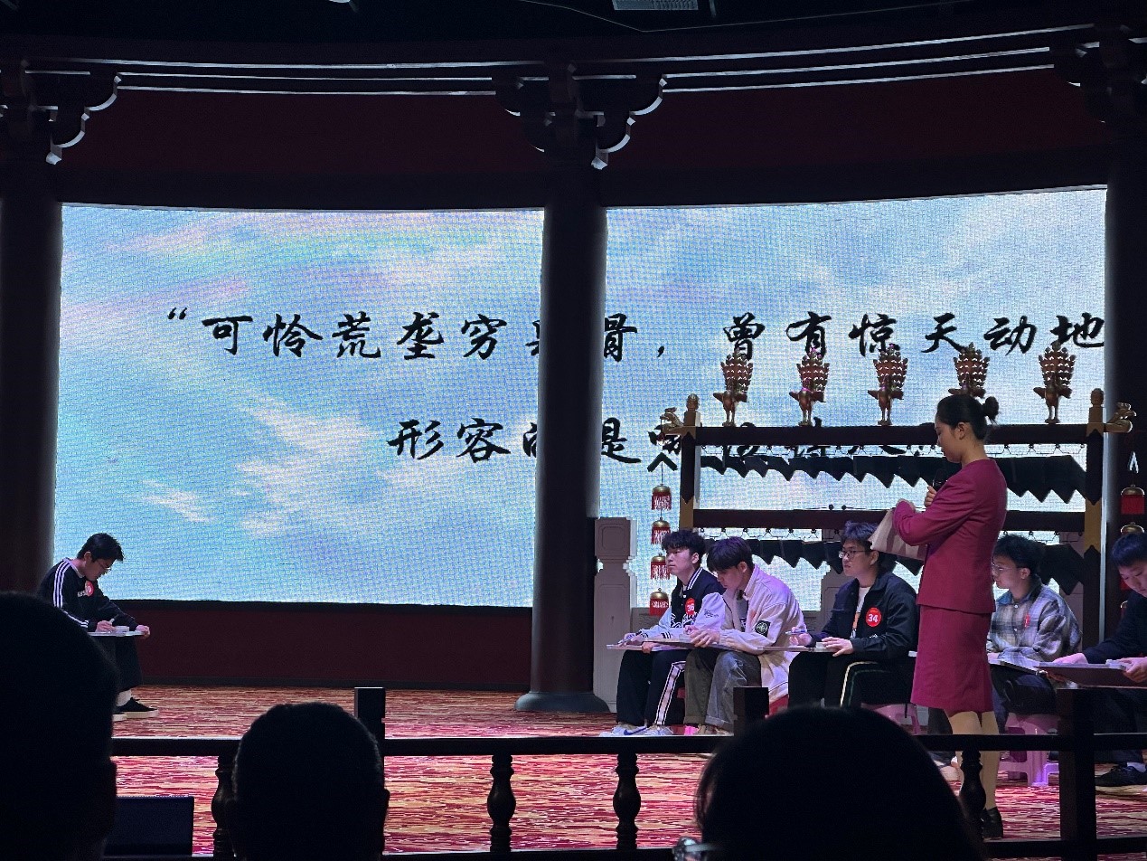 诗词大会分为“题板答题、飞花令、看图飞花令”三个篇章。赛中,我院选手镇定自信、机智作答,经过几轮激烈比拼,共有7名同学顺利进入半决赛,在“飞花令”大战中,比赛更是精彩绝伦,选手们对答你来我往、互不示弱,现场高潮迭起、掌声不断。