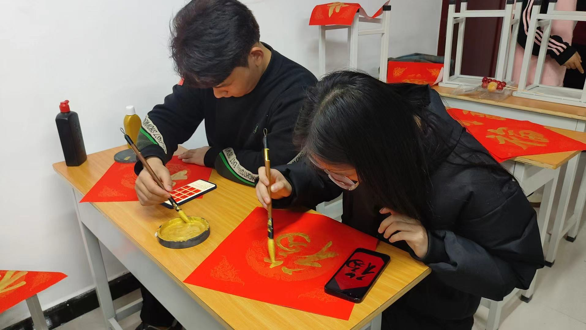 阵阵墨香指尖流, 浓浓祝福溢心间。写福字活动现场,毛笔、砚台整齐地摆放在桌子上, 鲜红的纸张渲染着浓浓的节日氛围。同学们尝试书写并创造不同的“福”字。一撇一捺,一横一竖,尽情享受挥毫泼墨带来的愉悦与幸福。