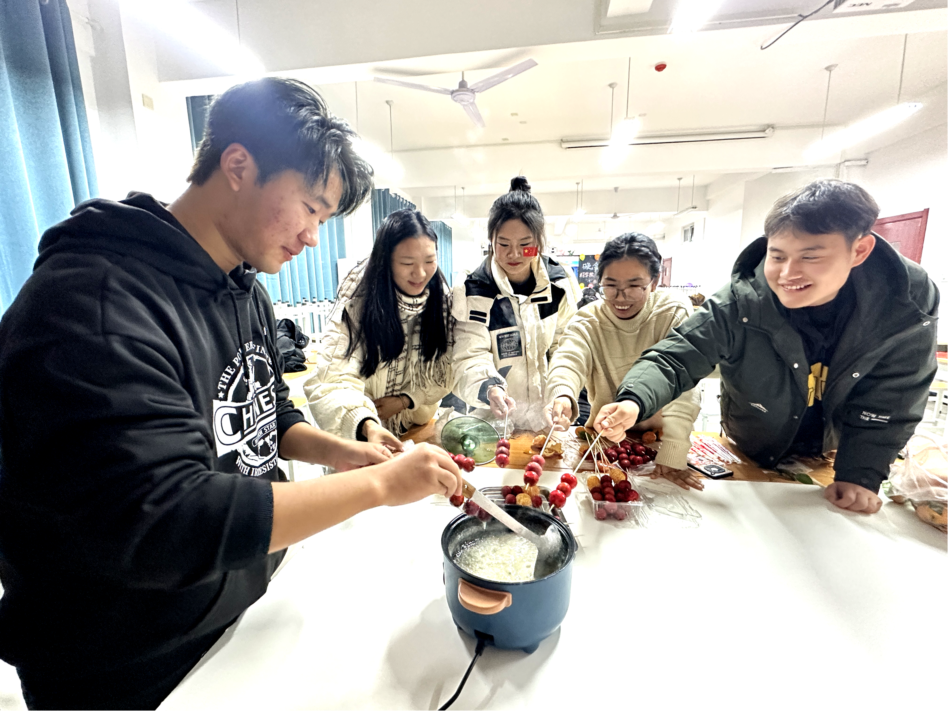 同学们根据自己的搭配灵感,用糖葫芦签子将不同水果块串起来,学着熬糖浆,再用勺子将煮好的糖浆水均匀地浇在山楂串上……