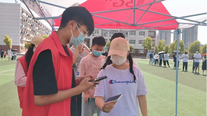 检测现场,我院志愿者提前到场组织各班同学排队,查看各班人数,提醒同学们提前进行登记预约,以便医护人员进行检测。同时要求同学们佩戴好口罩,间隔一米,各班同学在我院志愿者的带领下到达核酸采集处,在大家积极的配合下,此次全员核酸检测工作快速有效的完成。