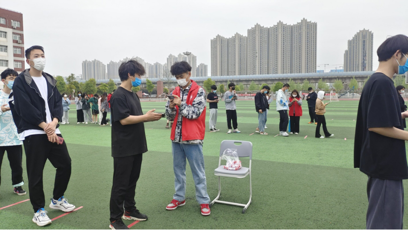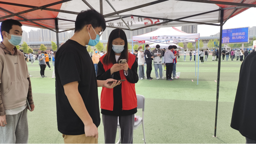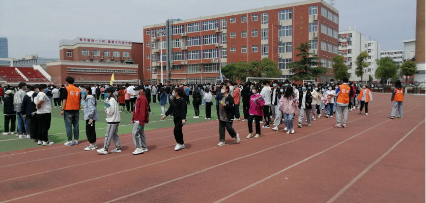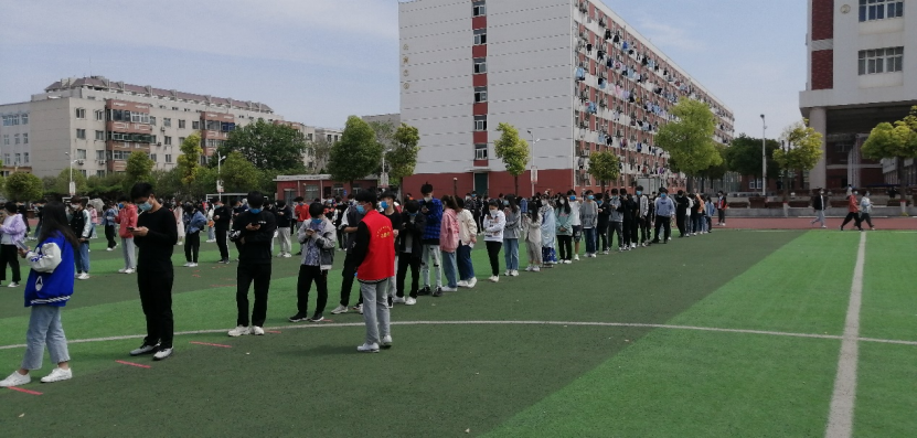 检测现场,我院志愿者提前到场,组织各班同学有序排队,查看各班到场人数,检查预约码情况,以便检测快速进行,同时要求同学们佩戴好口罩,间隔一米,检测人员在我院志愿者的引领下到达核算采集处,在大家积极的配合下,整个检测秩序井然。