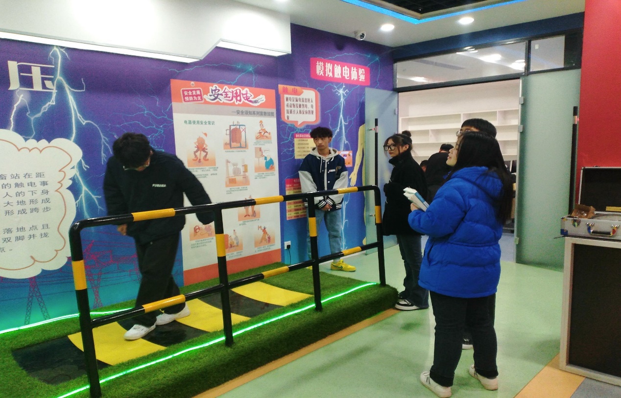 第二项:体验地震时逃生模拟和跨步电压所带来的真实感受,在地震倾斜小屋利用倾斜15°的设计,加上内部的视觉图制造出一定的眩晕感,让同学们在15秒内安全的通过,尝试在地震过后的恶劣环境中实现自救。