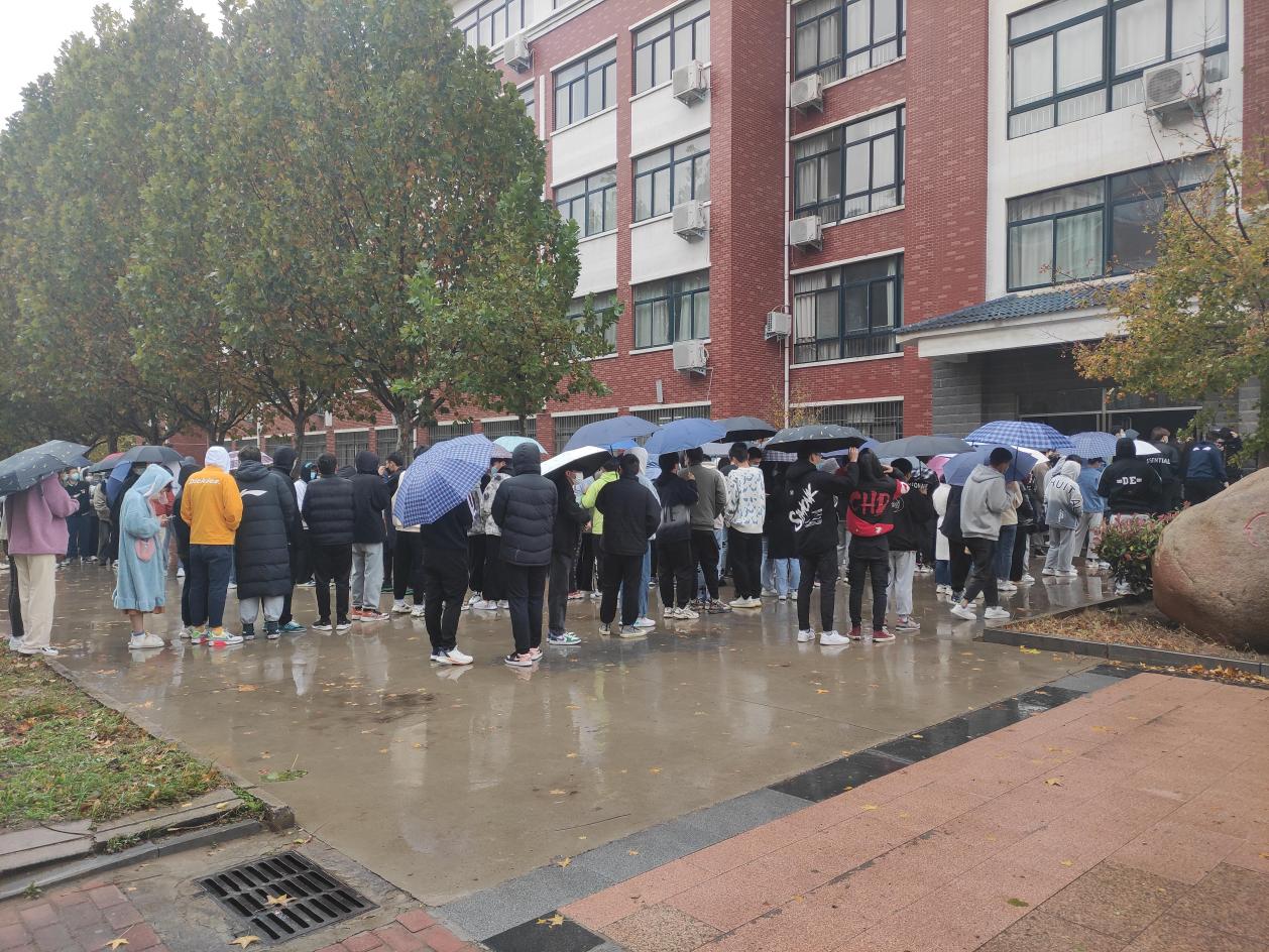 在核酸检测准备阶段,志愿者们帮忙拉好警戒线、分发防疫物资、做好消菌杀毒等工作,一切准备就绪后通知各班级按照学号到现场排队做核酸检测。