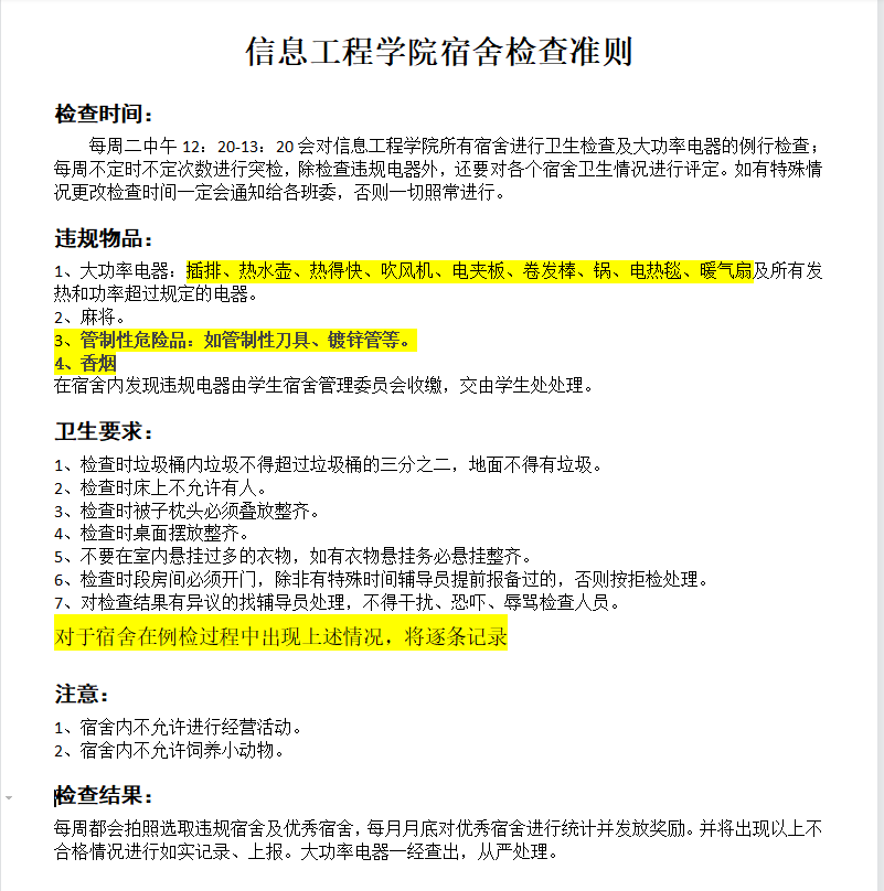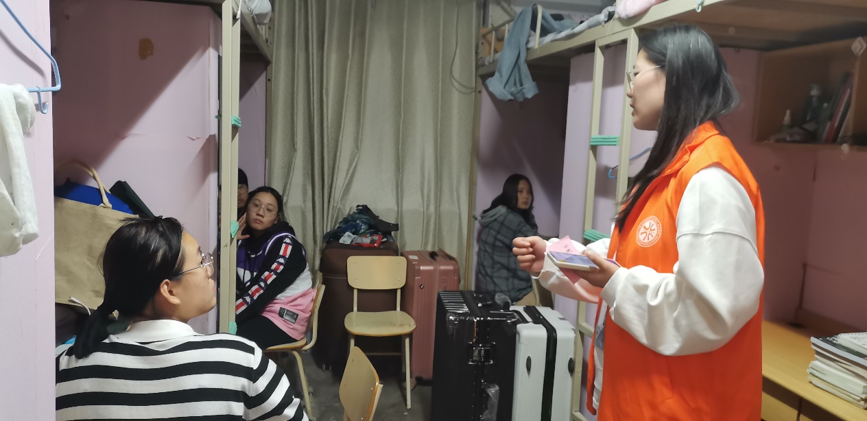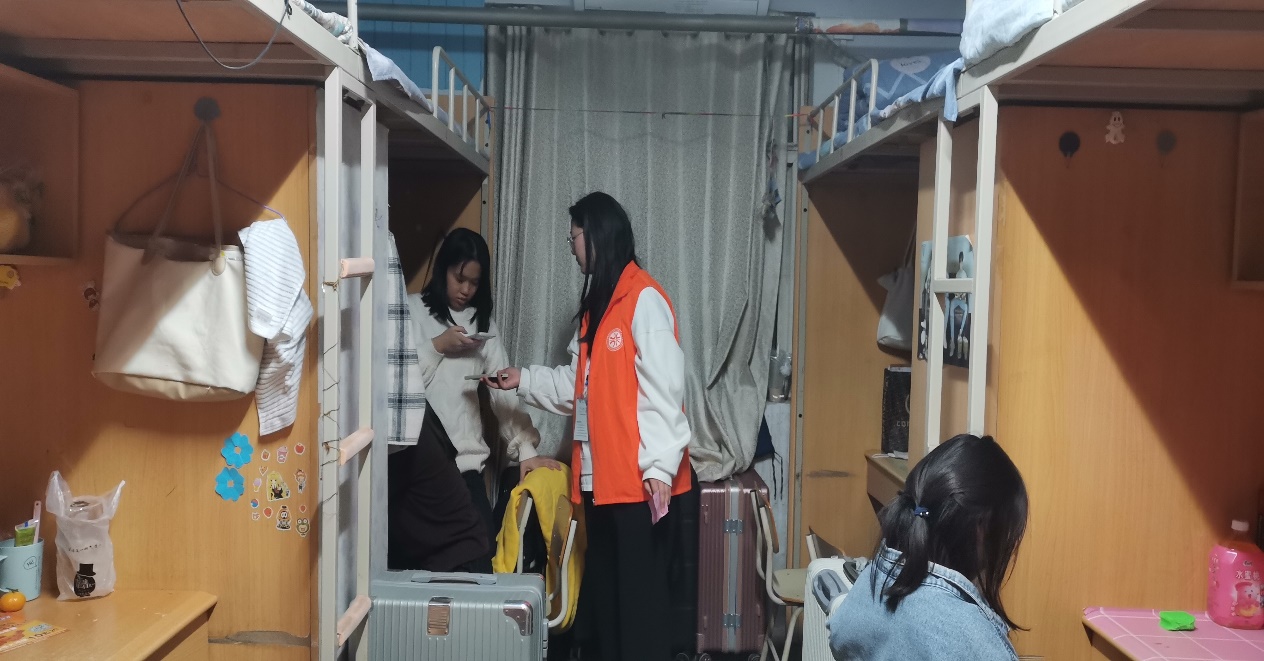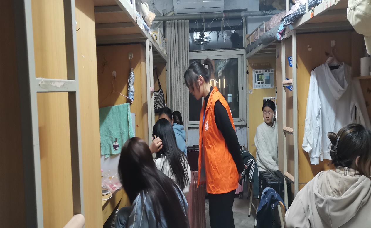 在本次查寝中,学生会工作人员逐个宿舍进行检查和走访,她们耐心、认真、细致地为我院的新生们讲解宿舍卫生的基本要求和宿舍检查的相关规定,针对同学们关于宿舍电器的使用问题进行了着重讲解,譬如要怎样安全地使用插排,并强调了在宿舍要安全用电,注意宿舍存在的安全隐患,提醒同学们不得使用违规电器。
