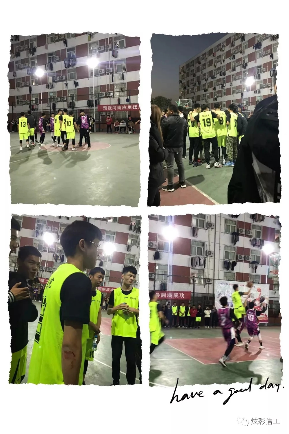下午17时40分,球员们和啦啦队员已经到场做着准备活动,随着裁判的哨响,整个球场就充满了紧张的气氛,球员的激情全都淋漓尽致的体现到此刻篮球场上。比赛进程中,各方队员都全力以赴,用心防守、有力阻挡,越战越勇,充分显示了他们极佳的心理素质。在场的同学也情绪高涨、击鼓呐喊,不时为队员打气、喝彩,气氛热烈。双方在赛场上拼抢很激烈,带球、运球、投篮等一系列动作潇洒、规范,引来围观同学一阵阵地喝彩。