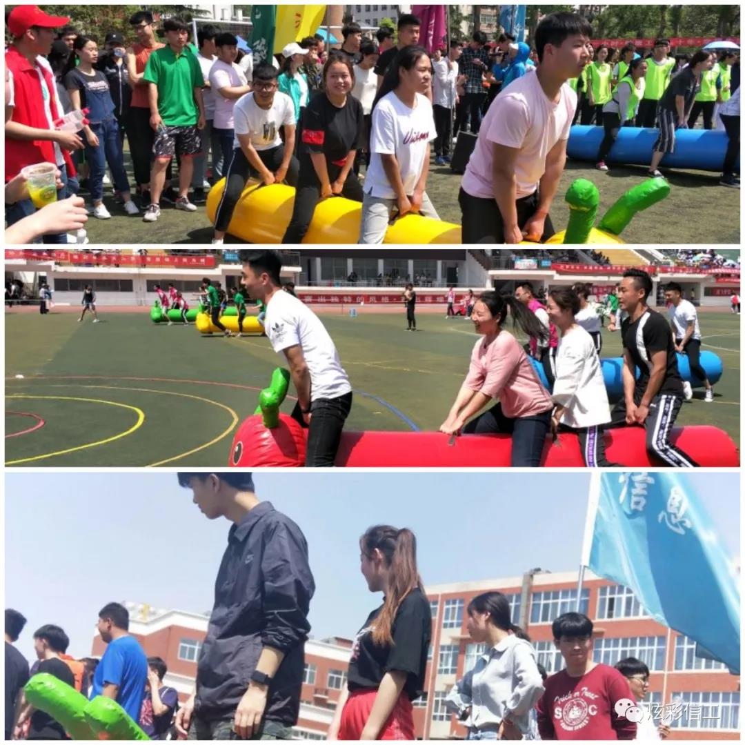 趣味比赛――骑毛毛虫,各位参赛选手跃跃欲试,正式开始比赛后迈着大步子冲向终点。