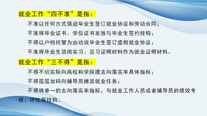 学院历来高度重视毕业生就业工作,认真落实就业“一把手”工程,建立学院领导、专职教师、辅导员、党员充分参与的就业工作推进小组。崔琳通报了截止目前2023届毕业生就业情况,强调要充分认识当前就业形势的严峻性,要求辅导员要提高政治站位,切实做好就业工作,摸排学生情况,建立台账,做好重点群体的就业帮扶工作,做好家校沟通。学院教师要继续全员参与、上下齐心整合就业资源与信息,进行高效精准对接,力争在就业“百日冲刺”行动中取得佳绩。会上,崔琳带领毕业班辅导员再次学习教育部关于就业工作的“四不准”“三不得”要求,要求所有辅导员注意工作方式方法,与学生及家长沟通过程中不得违反教育部相关规定。