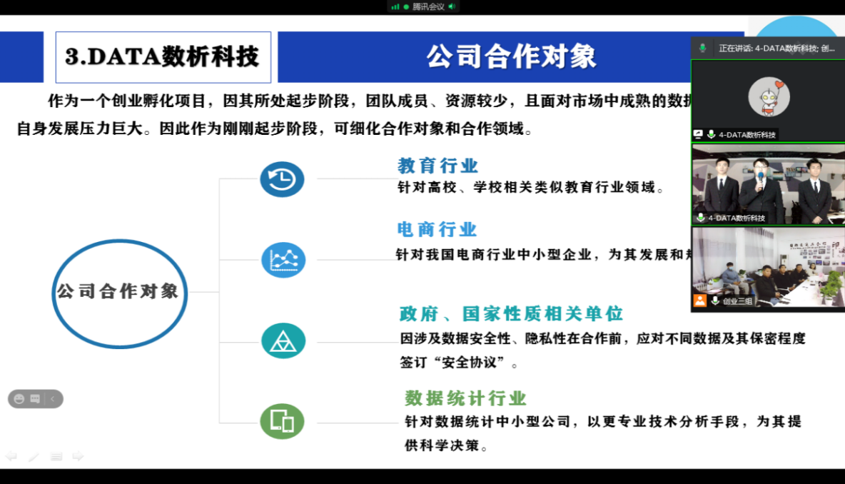12月19日,第十五届全国高等职业院校“发明杯”大学生创新创业大赛决赛在线上举办。由leyu乐鱼官方网站周少珂老师、李晨老师指导,大数据技术与应用专业王康健、任奥、李波、张文博、张明哲5名学生参与的创业项目“DATA数析科技——全国数据分析技术开拓者”,经过学校初赛、网络评选和线上决赛,在专家评委的共同评审下最终荣获全国二等奖。