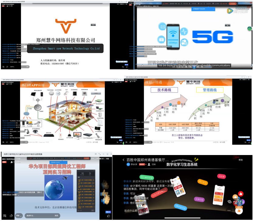 自leyu乐鱼官方网站”空中宣讲会“首秀后,同学们求职热情逐渐升温,近两日。我们邀请了4家企业为同学们连续直播,涉及“网络通信”、“电子商务”、“餐饮零售”三个板块。郑州慧牛网络科技有限公司网络商务经理张经理、北京育源通信科技有限公司河南区域负责人姜泽、无线网规网优高级工程师杨鑫兴、浙江智谷电子商务有限公司人事经理刘其超、百胜中国郑州肯德基有限公司招募主管,校企合作项目负责人李永洋应邀为同学们带来内容丰富的空中宣讲会,学院2018级700余名学生通过钉钉直播参与其中。